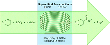 The methoxycarbonylation of cyclohexene with carbon dioxide over a ruthenium catalyst was realized in a micro flow system under supercritical conditions. Instead of the toxic and flammable carbon monoxide, this process utilizes carbon dioxide, thereby avoiding issues with bulk transportation of carbon monoxide as well as eliminating the need for safety precautions associated with the use of carbon monoxide. Obtained was a 77% yield of the ester product at 180 °C, 120 bar and with a 90 min residence time, which is over five times faster than for the same reaction performed under subcritical conditions in batch. An important factor for the performance of the system was to have a sufficiently polar supercritical mixture, allowing the catalyst to dissolve well. The optimal temperature for the reaction was 180 °C, as the activity of the system dropped considerably at higher temperatures, most likely due to catalyst deactivation.