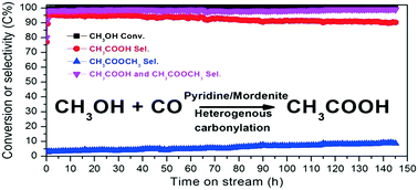 Halide-free and noble metal-free pyridine-modified H-mordenites exhibit high stability and selectivity in methanol carbonylation to acetic acid.